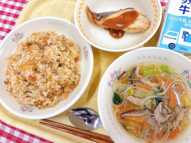 シャキッとした食感が楽しいキムタクごはんに、ゆずの香りが広がる魚料理。和風ビーフンスープのやさしい味が全体をまとめます。学校給食は、時代の流れの中で続いてきました。今こうして温かい給食を食べられることも、あらためて大切に感じたい一日です。