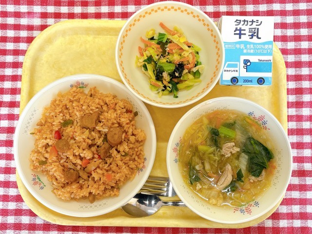 ジャンバラヤ、小松菜ツナレモンサラダ、春雨スープ、牛乳