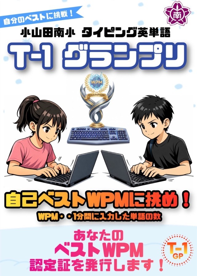 T-1グランプリは「タイピングONEグランプリ」の略で、WPM(Words per minute)と呼ばれる、1分間にキーボードで入力できる英単語数を記録として競う取組です。子どもたちはこれまでの自分の最高記録更新を目標に、集中してタイピングに挑戦しています。楽しみながら技能を高めることで、英語への親しみと学ぶ意欲を育てる学習イベントとなっています。