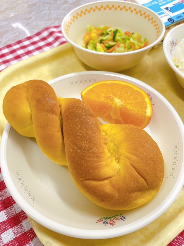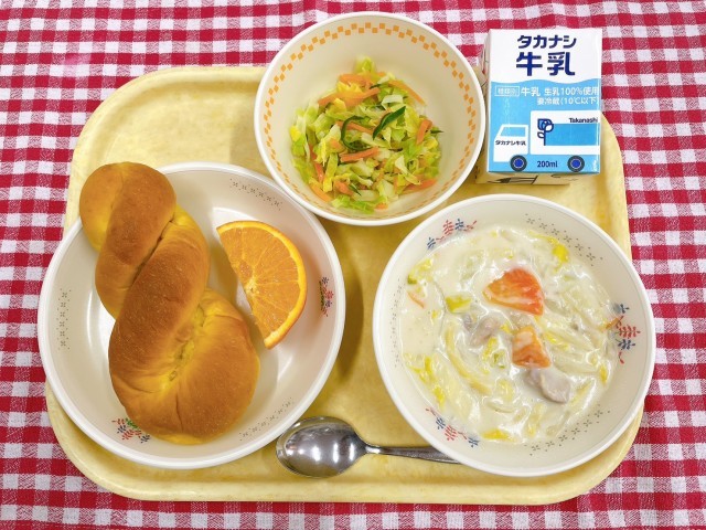 パンプキンパン、白菜とマカロニのシチュー、コールスロー、ネーブルオレンジ、牛乳