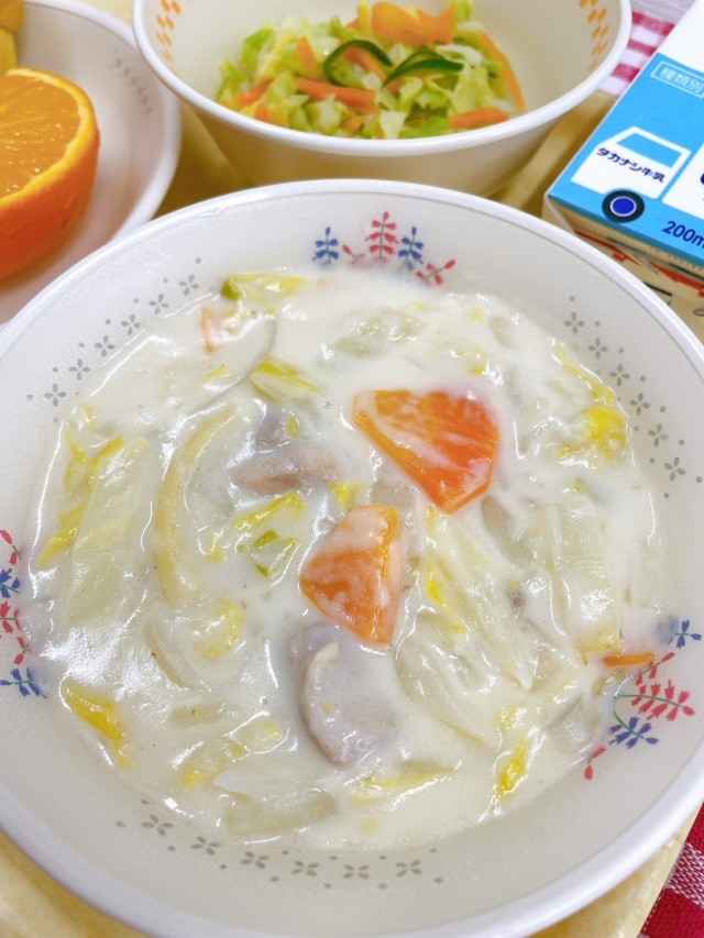 初登場のパンプキンパンは、かぼちゃが練りこまれたやさしい色合いのパン。白菜を使ったシチューは冬ならではの甘みが感じられ、マカロニの食感も楽しい一皿。新しいメニューに出会うわくわく感を大切にした献立です。