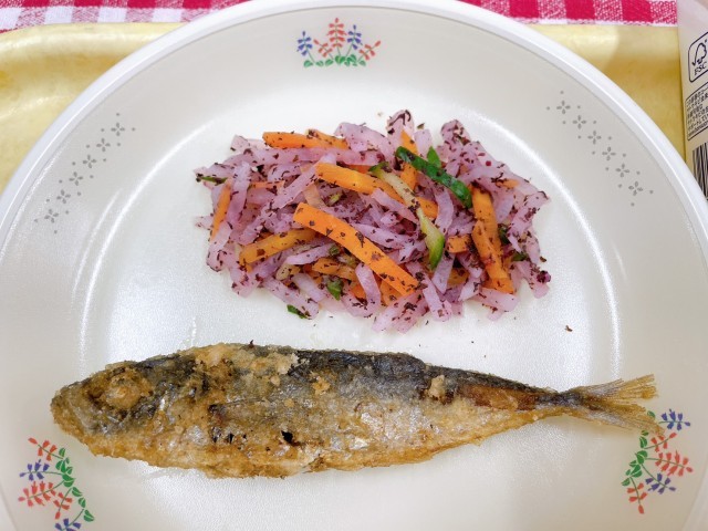 ごはんに入っている黄色い粒は「きび」。いつものごはんより、少しもちもちした食感になります。肉じゃがや小あじの唐揚げと合わせ、噛む楽しさを感じられる献立。雑穀を取り入れることで、主食のバリエーションも広がります。食感の違いを味わいながら食べてほしい一日です。