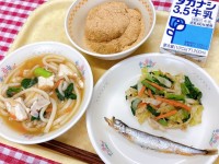 ごはん、まだいとじゃがいもの揚げ煮、野菜の梅おかかあえ、麗紅、牛乳