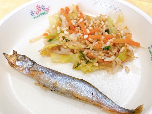 焼きししゃもや玄米サラダと組み合わせ、食感の違いも感じられます。