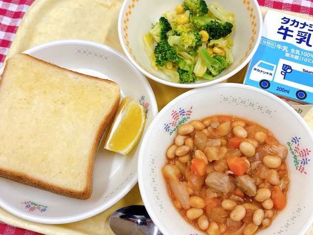 はちみつレモントースト、チキンビーンズ、ブロッコリーサラダ、はるか、牛乳