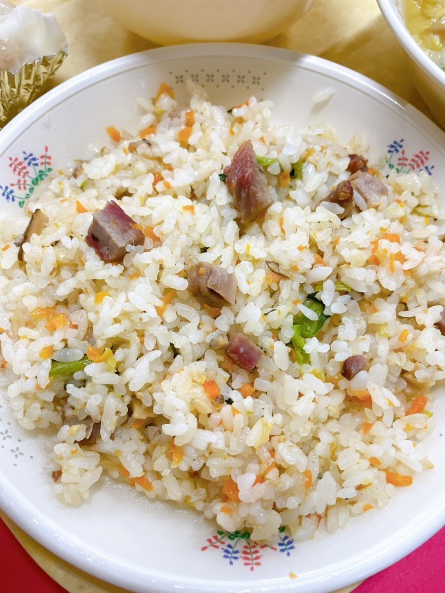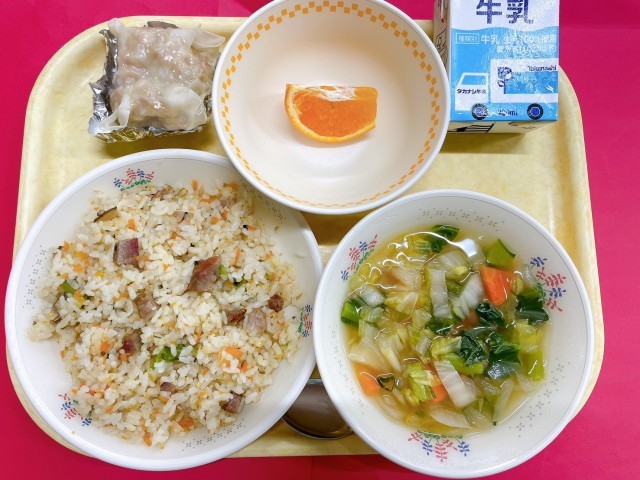 大きなジャンボしゅうまいが目を引く献立。青菜のチャーハンと合わせ、食べごたえも十分です。見た目の楽しさも、給食の大切な要素。しっかり食べて、元気をチャージしたい一日です。