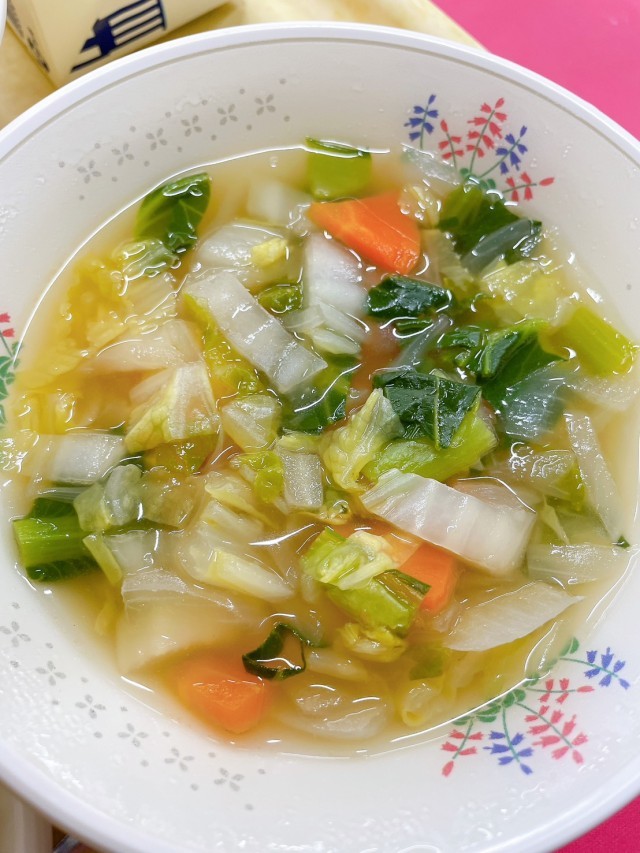 青菜のチャーハン、ジャンボしゅうまい、白菜スープ、牛乳