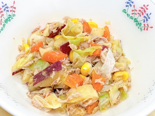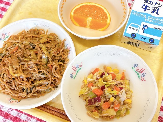 ソース焼きそば、さつまいも入りツナサラダ、きよみオレンジ、牛乳