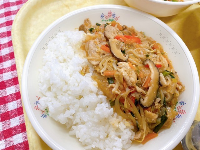 今日の給食は、韓国料理を取り入れたメニューです。プルコギ丼の「プル」は火、「コギ」は肉という意味で、甘辛い味つけのお肉と野菜をごはんにのせて食べます。