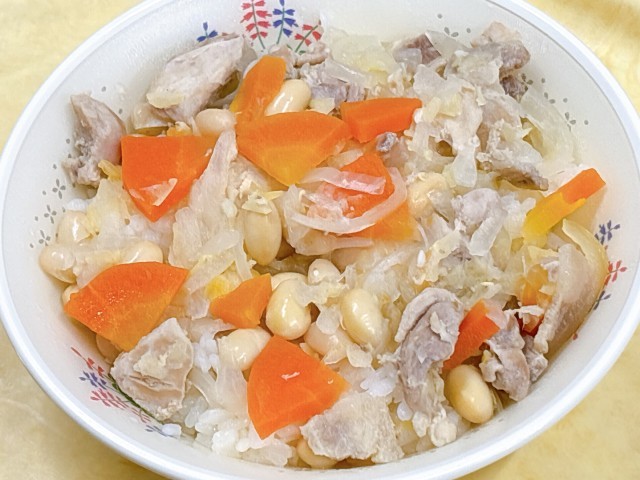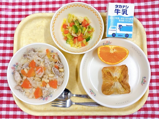 チキンと豆のリゾット、カラフルサラダ、パンプキンパイ、きよみオレンジ、牛乳