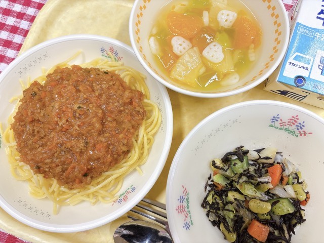 スパゲッティミートソース、大豆とひじきのサラダ