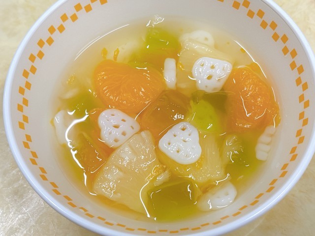 、ハートのフルーツポンチ、牛乳いよいよ今年度の給食も今日を含めてあと2回。