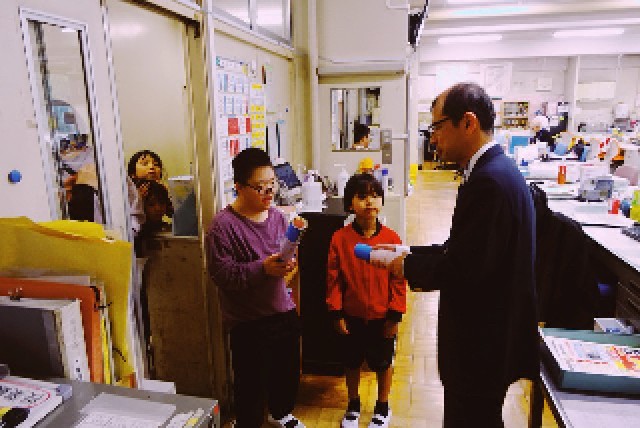 (写真は、職員室に届けに来てくれたときの様子です。副校長先生が受け取ってくれました。)