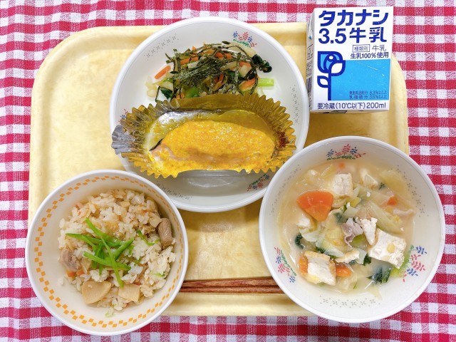 たけのこご飯、鮭のあけぼの焼き、野菜の磯香和え、呉汁、牛乳