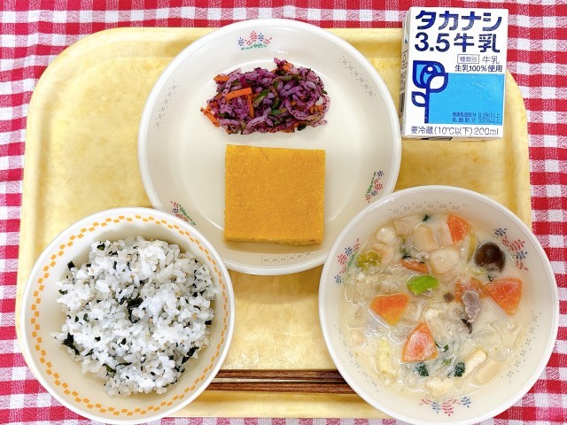 わかめご飯、たまご焼き、野菜のゆかり和え、野菜とお麩のまろやか豆乳汁、牛乳