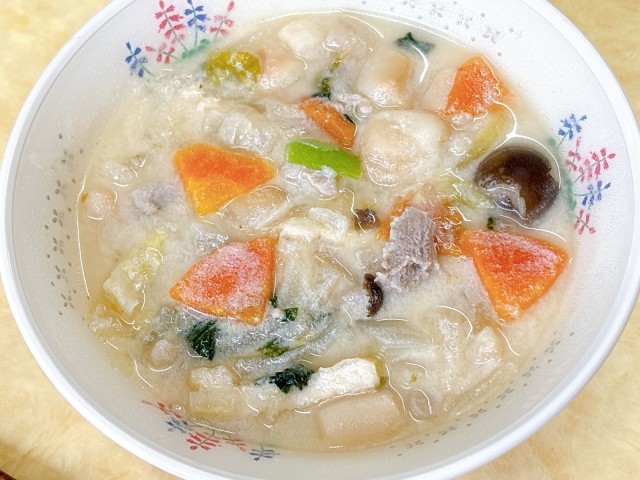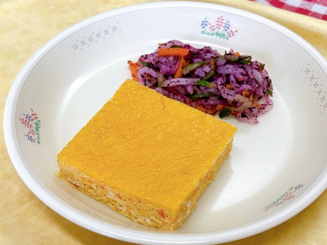 南小のたまご焼きは、見た目も味も最高で人気の定番おかずです。野菜とお麩のまろやか豆乳汁は、豆乳のコクでほっとする味わい。