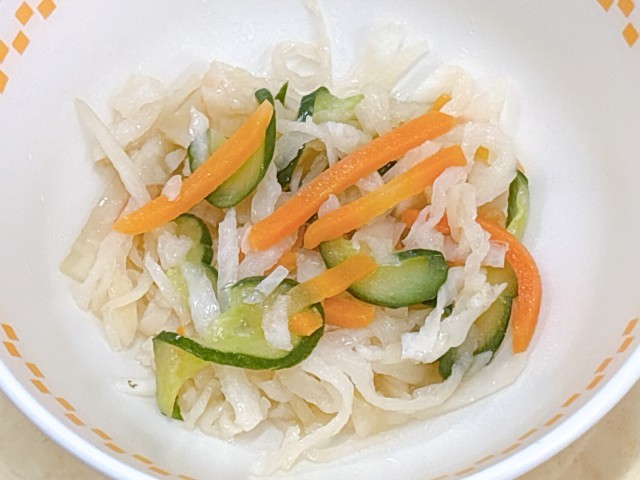 キムチとたくあんを組み合わせたキムタクごはんは、発酵食品のうま味が生きた人気メニューです。切干大根は、乾燥させることで甘みとうま味が凝縮され、食物せんいやカルシウムも豊富に含まれています。具だくさんの豚汁は体を温め、野菜をたっぷりとることができます。発酵食品と野菜の力で体の調子を整え、元気を支えてくれる組み合わせです。