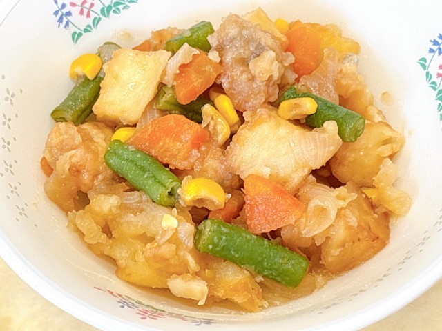 角切りにしたホキとじゃがいもを油で揚げ、甘辛いタレをからめました。ホキはくせが少なくやわらかい白身魚で、たんぱく質が豊富です。