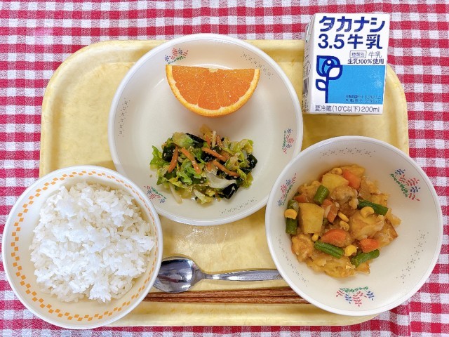 ごはん、ホキとじゃがいものあげに、キャベツとわかめのあえもの、くだもの、牛乳