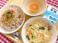 高野豆腐のそぼろご飯、カミカミ和風サラダ、たまごスープ、牛乳高野豆腐は豆腐を凍ら...