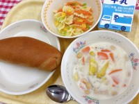 黒砂糖パン、お芋とお豆のクリームシチュー、マカロニとコーンのサラダ、牛乳あったか...