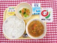 まち☆ベジ米粉チキンカレーライス、大豆とひじきのサラダ、ヨーグルト、牛乳今日は運...