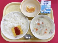 バターライス、スパニッシュオムレツ、ほたてのクラムチャウダー、いよかん、牛乳6年...