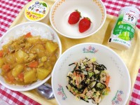 米粉カレーライス、ツナとのりのサラダ、いちご、ゆずゼリー、ジョアいよいよ今年度最...