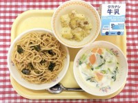 小松菜とツナの和風スパゲッティ、野菜のミルクスープ、ジャーマンポテト、牛乳つばさ学級のみんなが給食の残食ゼロをめざして取り組んできた学習「ベジクエ(ベジタブルクエスト)」。12月に野菜を美味しく食べら...
