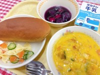 小松菜のピラフ、大豆とひじきのサラダ、クラムチャウダー、牛乳 他ピラフには鉄分やカルシウムが豊富な小松菜がたっぷり入っています。彩りもよく、野菜が苦手な子も食べやすい味つけになっています。大豆とひじき...