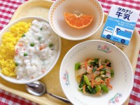 ご飯、魚のクリームソース、カラフルサラダ、りんご、牛乳本日の魚のクリームソースにはマス(鱒)を使いました。やわらかいマスとクリームなマッチしたまろやかな味わいの料理です。魚のうま味とミルクのコクが合わ...