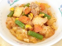 ごはん、ホキとじゃがいものあげに、キャベツとわかめのあえもの、くだもの、牛乳角切りにしたホキとじゃがいもを油で揚げ、甘辛いタレをからめました。ホキはくせが少なくやわらかい白身魚で、たんぱく質が豊富です...
