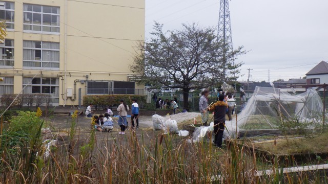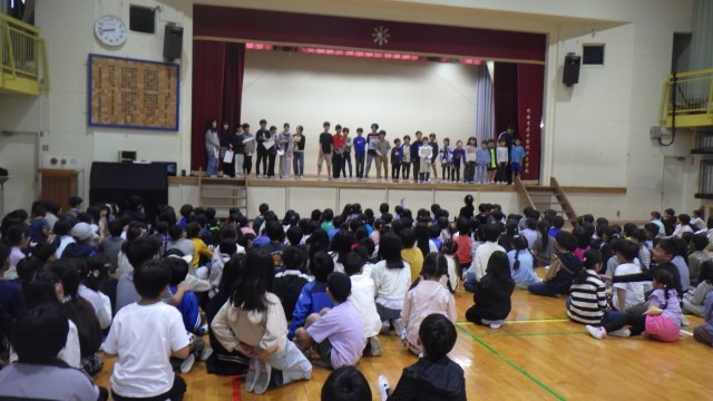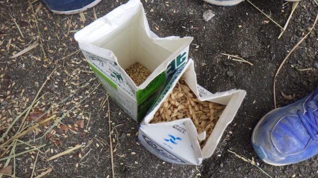 上の写真は児童集会の様子、下の写真は5年生稲の脱穀の様子です。