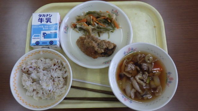 今日は「古代米ご飯」です。麦、きび、赤米、などが入っていて色とりどりのご飯です。