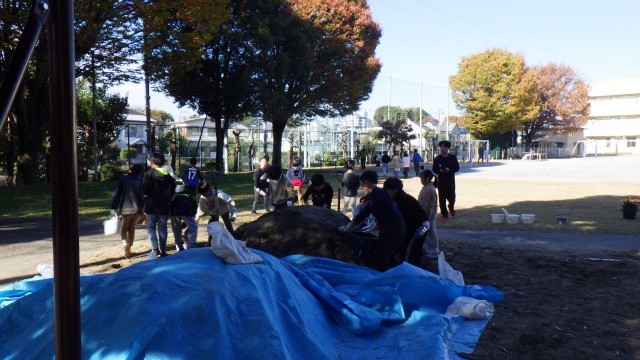 秋晴れの過ごしやすい日が続いています。今日は「しばとも」田村さんの協力の下、芝の手入れを行いました。それより子供たちは大きな砂山に注目。「絶好の砂遊び?」といった目つきで黙々と作業をしていました。