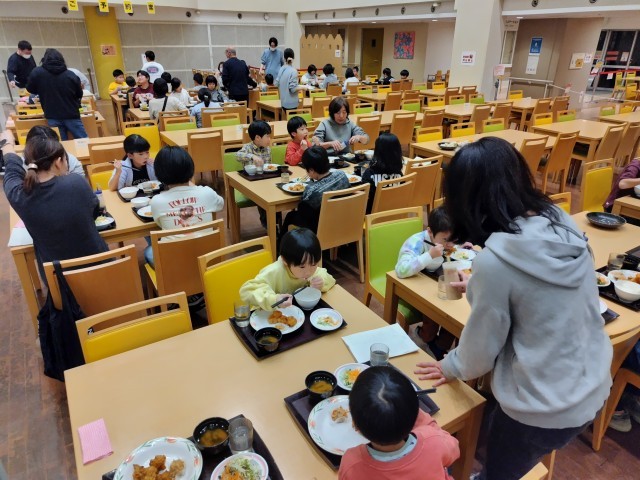 夕食の様子です。みんな、唐揚げ等よく食べ、おかわりをする人もいました。