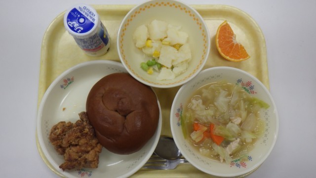今日の給食はココアパン、ジョア、フライドチキン、