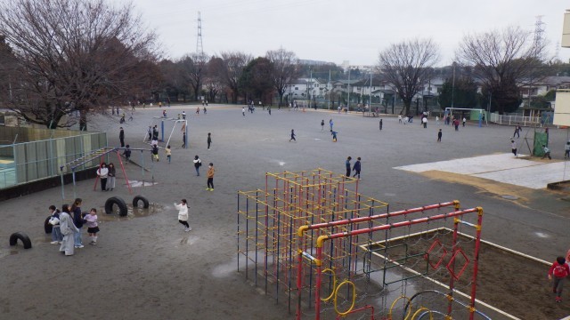 雨も中休み時間は降っていなかったので、ご覧の通りたくさんの児童が校庭で遊んでいました。