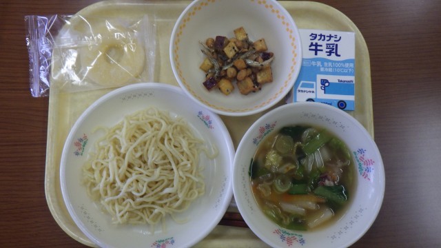 今日の給食は、つけめん、豆かりんとう、くだもの(冷凍パイン)です。