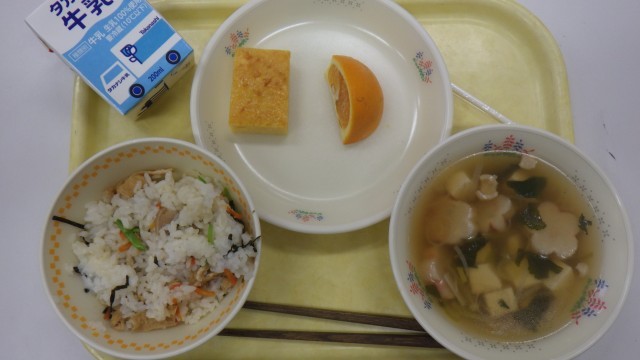こんだては、きつねちらしずし 塩こうじの卵焼き すまし汁 清見オレンジです。