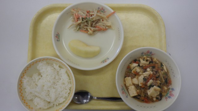 今日の給食は ごはん マーボー豆腐 じゃがいものゴマみそマヨ和え りんごです。