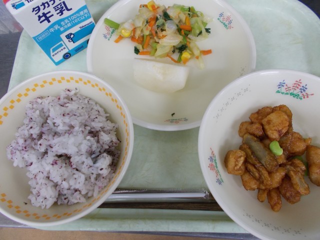 牛乳・ゆかりごはん・チキンチキンごぼう・和風サラダ・なし