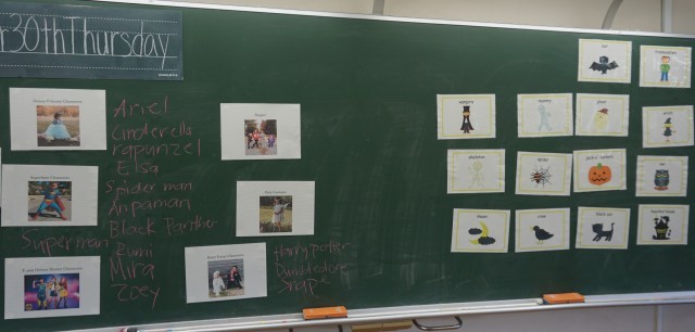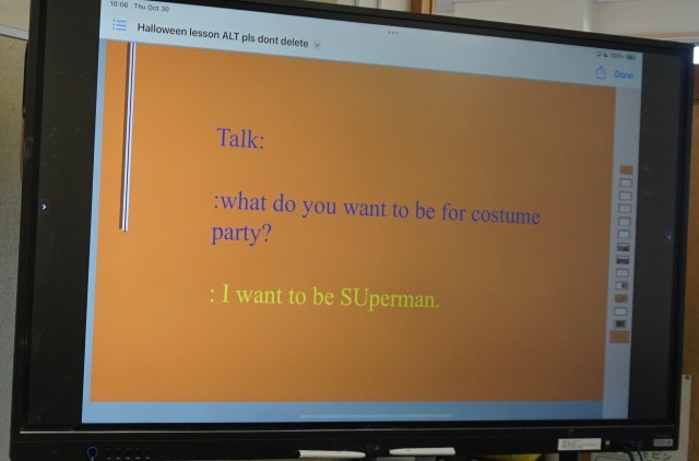 外国語の授業で仮装パーティーについて学びました。子どもたちは楽しみながら、ALTの先生から外国でのパーティーの様子や、関連キャラクターの呼び方等を確認していました。
