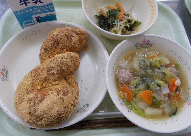 牛乳・きなこパン・白菜と肉団子のスープ・わかめ入りサラダ