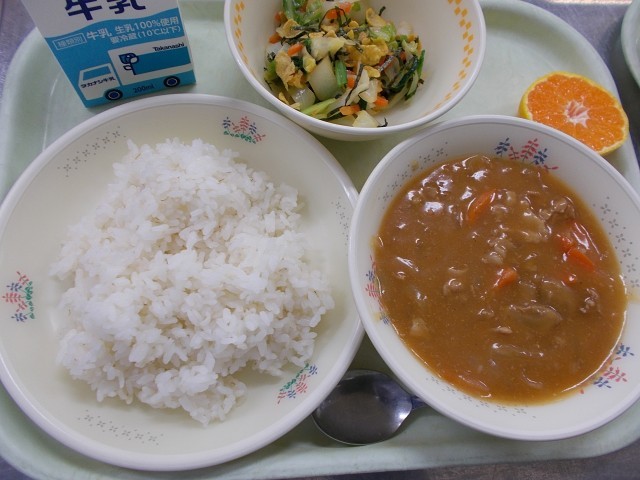 牛乳・ハヤシライス・コーンフレークとのりのパリパリサラダ・みかん