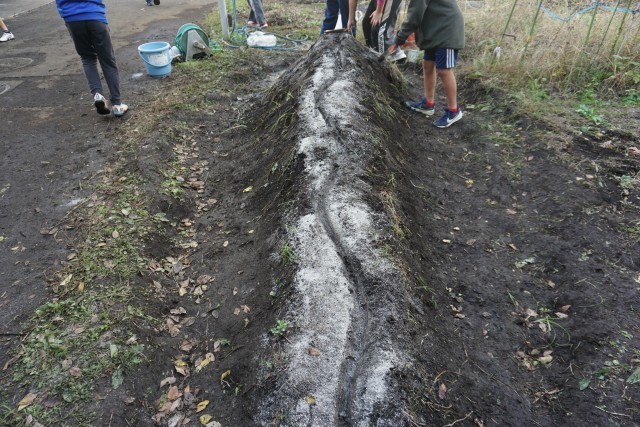 5年生の理科では、「流れる水の働き」について学習しています。学校敷地内の畑を活用して、実際に水を流す実験を行いました。