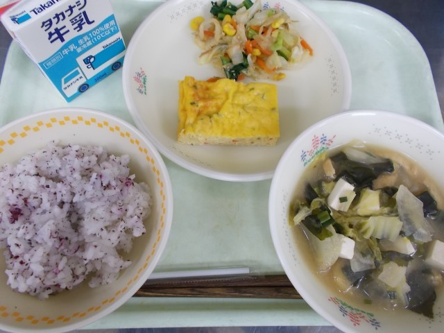 牛乳・ゆかりごはん・卵焼き・おひたし・みそ汁