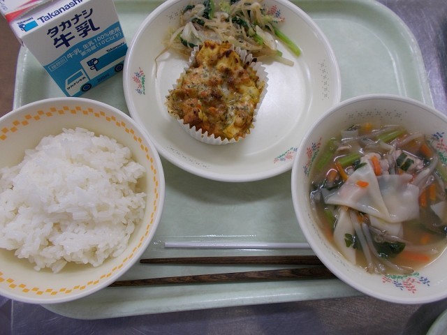 牛乳・ごはん・生揚げのカレーチーズ焼き・小松菜と春雨のナムル・ワンタンスープ