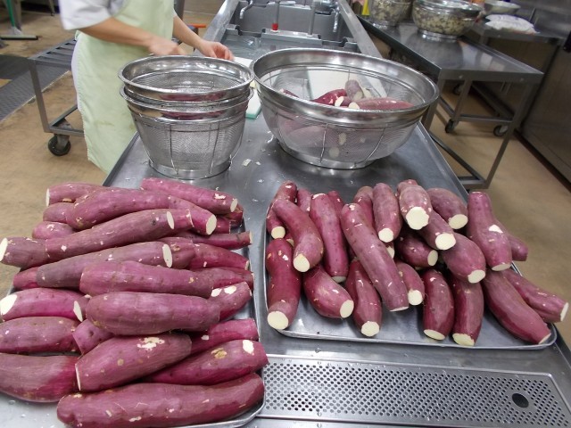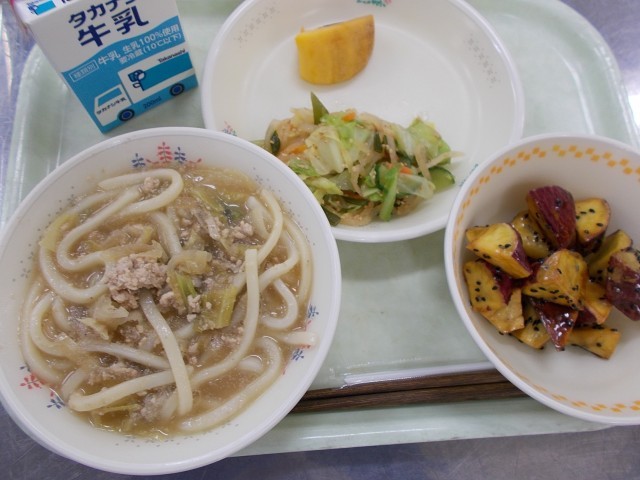 【おはなし給食】牛乳・白ごまタンタンうどん・茎わかめサラダ・「大学芋」・柿