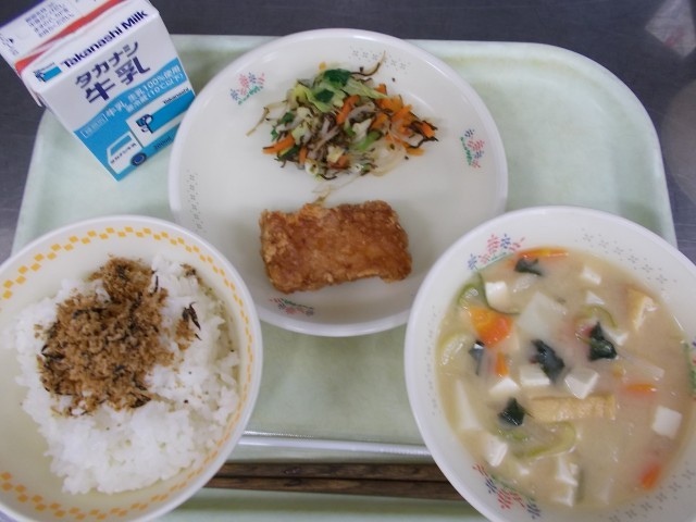 【おはなし給食】ごはん・「手作りふりかけ」・いかのかりん揚げ・野菜の昆布あえ・呉汁